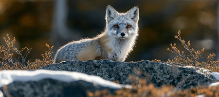 Two corsac foxes rest in a natural habitat, showcasing alertness and tranquility amidst autumn foliage, highlighting wildlife behavior
