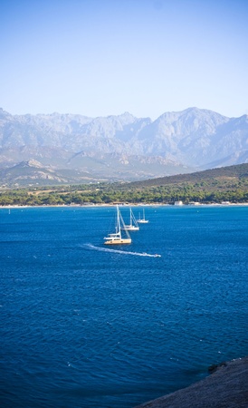 sailboat navigating the bay just outside Calvi on the island of Corsica
