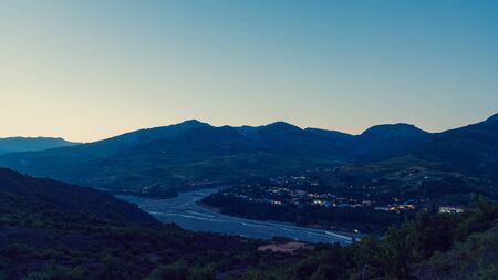 Dusk falling over the village of Monticello in the Balagne region of Corsica with the red rock of Ile Rousse and Mediterranean sea in the distance