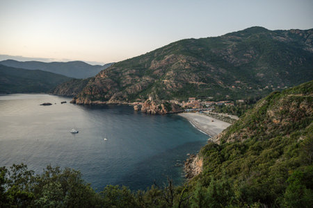 Spectacular view at Sagone Corsica France beautiful sand Beach boats mountain village Tourism and vacations concept