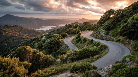 Serpentine Mountain Road at Sunset Basking in Golden Light and Cloudy Sky