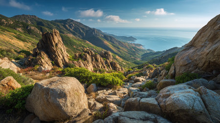 Dramatic Coastal Mountain Landscape with Rocks and Verdant Valley Views