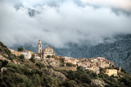 The ancient mountain village of Nessa in the Balagne region of Corsica under dark storm clouds