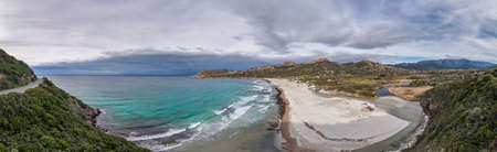 Panoramic view of Ostriconi beach and turquoise mediterranean in the Balagne region of Corsica with the Desert Des Agriates in the distance