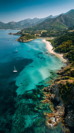 Stunning aerial view showcasing the turquoise waters, sandy beach, rocky coastline, lush green vegetation, and distant mountains of a picturesque Corsican landscape.