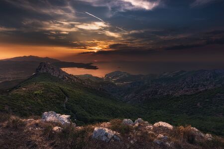 Sun rising over the silhouetted coastline of Cap Corse and the ancient mountain village of Speloncato in Corsica