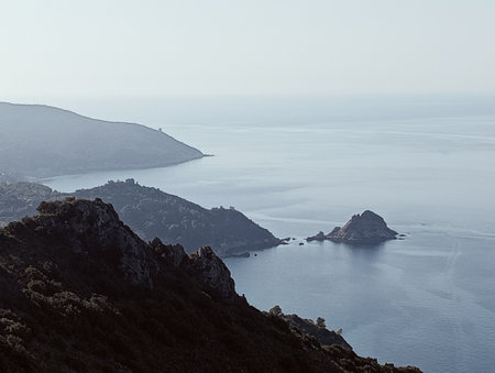 Breathtaking views of the northern tip of Corsica, Cap Corse. Deep precipices, high mountains and an azure blue or turquoise sea.