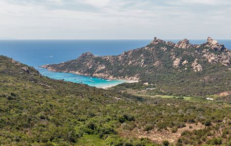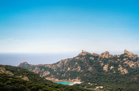 Landscape of Southern Corsica island coast, France. Genoese Tower Lion De Roccapina and beach.