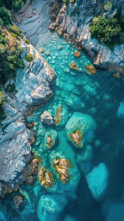 Aerial View of a Body of Water Surrounded by Rocks, Overhead view of a serene azure sea meeting a rocky coast, AI Generated