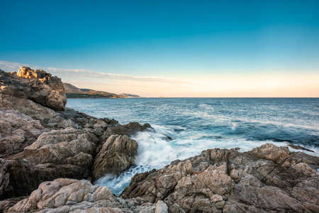 Waves washing onto the rocky coast of Corsica at Lozari as dawn breaks over Ile Rousse in the distance