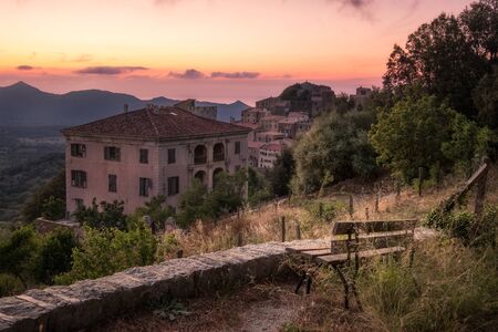 An old bench with a view of the sunset over the ancient mountain village of Belgodere in the Balagne region of Corsica with the Mediterranean in the distance