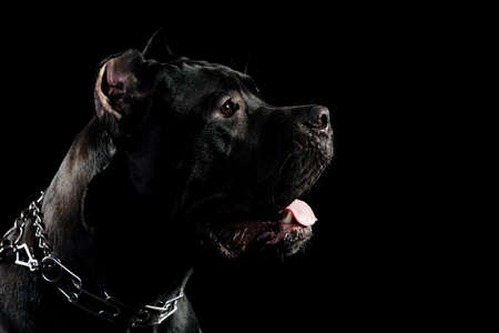 Portrait of a Cane Corso dog breed on a black background. Italian mastiff puppy.