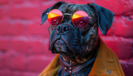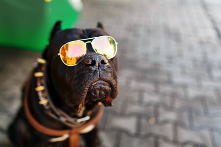 A brutal black dog in gold sunglasses with a studded collar. Boxer funny dog concept