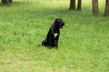 portrait of a black Italian Cane Corso in a park on a green lawn. Strength, power, muscle, dog. Sunny day