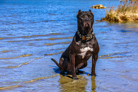 Cane corso. Beautiful purebred black dog looking to the camera close up