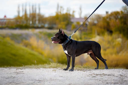 A big dark pitbull walking with owner outdoors. Cute dog standing near the man on the nature background. Close-up of dog. Animal concept.
