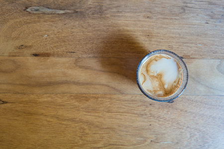 A glass of espresso shot mixed with cold fresh milk on wood background and copy space. Perfect drink for summer time.