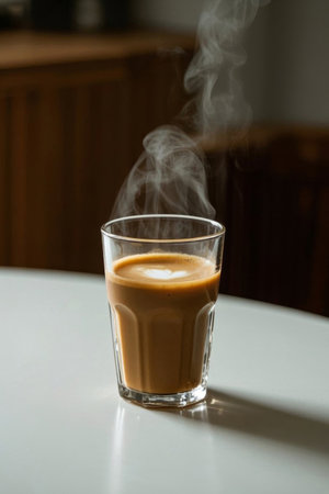 A delicious coffee drink with beautiful latte art displayed in a clear glass, resting on a woven placemat in a cozy, sunlit setting.