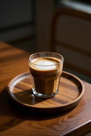 Flat-white coffee in small glass served on wooden tabletop side view.