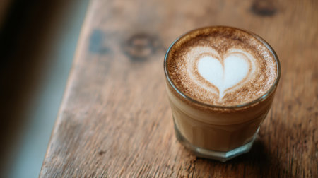 A warm latte with a heart design sits on a rustic wooden table inviting relaxation.