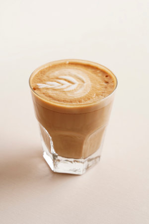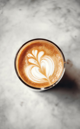 Glass of latte with coffee art on light gray marble table. Top view with copy space. Menu or drinks design concept. Generative AI.