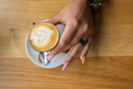 Close Up of Hand Holding Coffee Cup with Leaf Latte Art on Wooden Table
