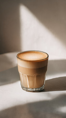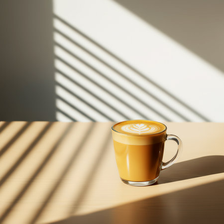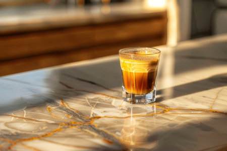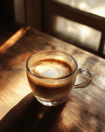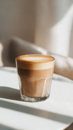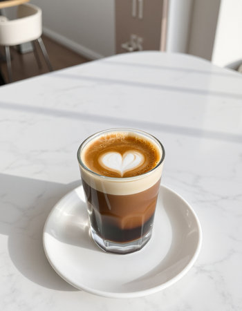 A beautifully crafted latte with intricate foam art rests in a glass, illuminated by soft sunlight. Scattered coffee beans on the marble surface enhance the cozy morning vibe.
