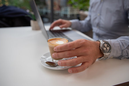 A businessman drinks coffee while working on his laptop, close-up of his hand