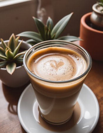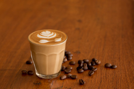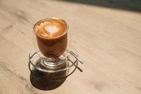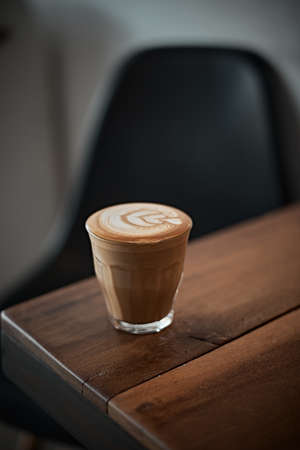 latte coffee with attractive pattern in a glass cup on a wooden table