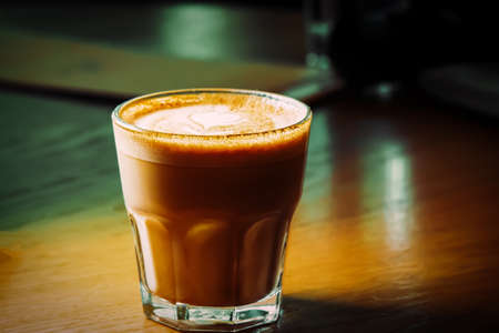 Coffee piccolo latte on wooden desk in coffe's shop.