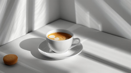 An elegant presentation of a coffee cup on a saucer, with a small cookie, set against a minimalist background