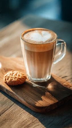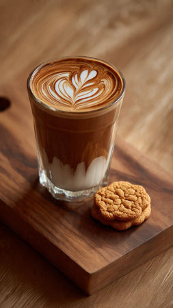 Latte with artful milk patterns, shot from above, set on a natural wood table with warm lighting, exuding a relaxed coffeehouse vibe.
