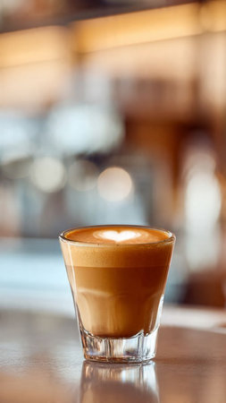 Hand holding a cortado, blurred cafe environment. AI generated.