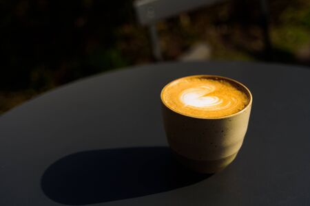 Cup of cappuccino with latte art on black table. Beautiful foam, ceramic cup, place for text, hard sun light