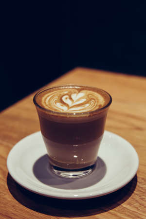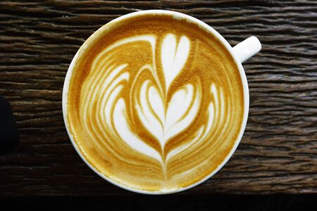 hot art latte coffee in a cup on wooden table,cup of coffee on brown wooden table