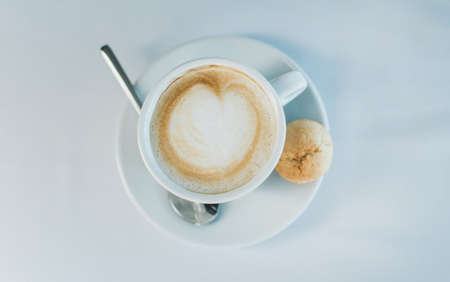 A cup of cappuccino with with a cookie on a saucer on a white surface, flat lay concept