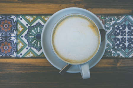 Top view of cup of cappuccino on the table. Morning coffee. Hipster cafe concept. Vintage coffee.