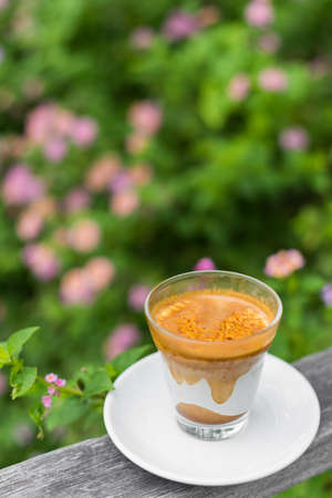 Dirty coffee - hot coffee with cold milk against nature background
