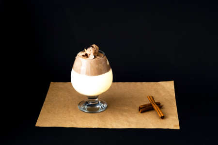 mini cup of cappuccino in a glass cup on black background with copyspace