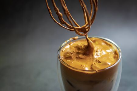 Dalgona Coffee; fluffy whipped coffee on milk. Coffee is a beverage made by whipping equal proportions of instant coffee, sugar and hot water until it becomes creamy and adding it to cold or hot.