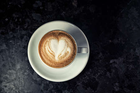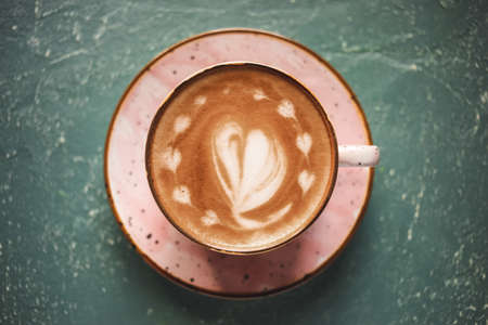 Cup of cappuccino with perfect latte art on the table. Top view, macro.