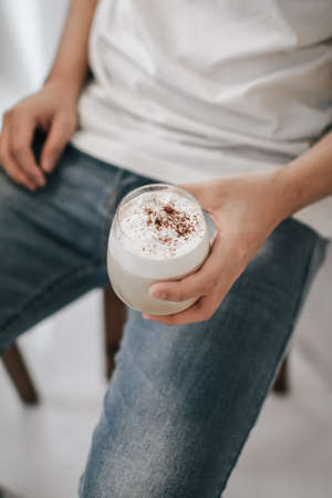 The hot cappuccino cup, decorated with milk foam and sprinkled with coffee powder, gives a very pleasant feeling to drink with copy space