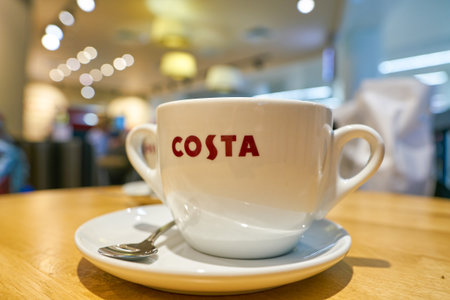 NIZHNY NOVGOROD, RUSSIA - CIRCA JULY, 2018: close up shot of a cup on a table at Costa Coffee in Strigino International Airport.