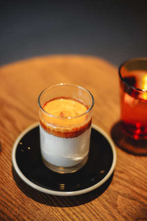 Hot coffee pour on top cold milk and cream in shot glass.