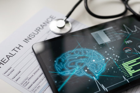 Modern social health insurance program. Tablet computer with healthcare application interface on screen. Stethoscope, x-ray image and cardiogram on wooden desk. Digital healthcare technologies