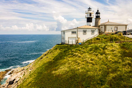 Panorama of Cabo Ortegal lighthouse on steep rocky cliff atlantic ocean bay of biscay Carino Cape Galicia Spain