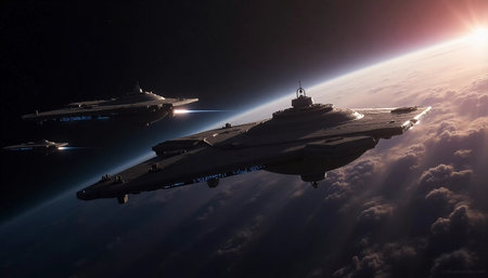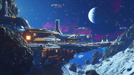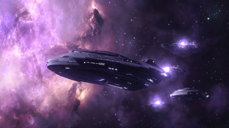 In the serene twilight of the cosmos, sleek spaceships embark on a journey through the universe, illuminating the dark void as they explore uncharted territories and distant galaxies.