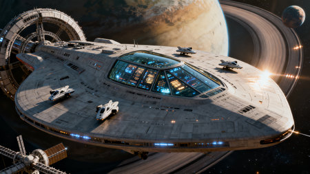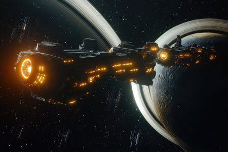 A futuristic spaceship hovers near a ringed planet, illuminated by orange lights against a cosmic backdrop.