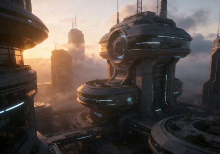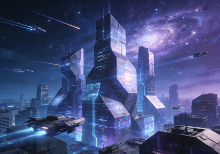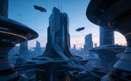 Futuristic cityscape with high tech buildings and digital hologram elements