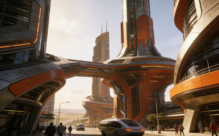 Futuristic smart city with towering buildings, Futuristic cityscape creative concept illustration with fantastic skyscrapers, towers, tall buildings, Ai generated